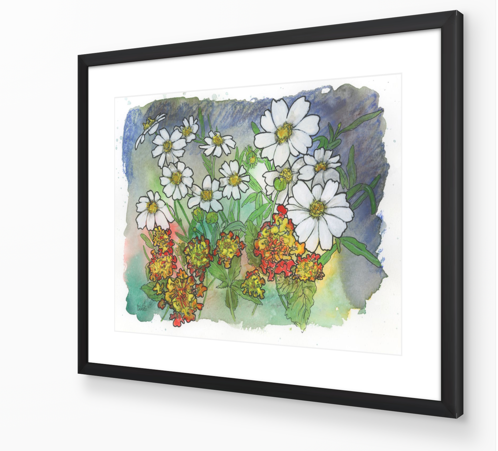 This piece brings together Texas white daisies and lantana—two plants that thrive in heat, neglect, and stubborn soil. The daisies rise light and open while the lantana clusters below with dense color and unruly energy. Drawn in ink and softened with watercolor washes, the composition balances delicacy and resilience.
