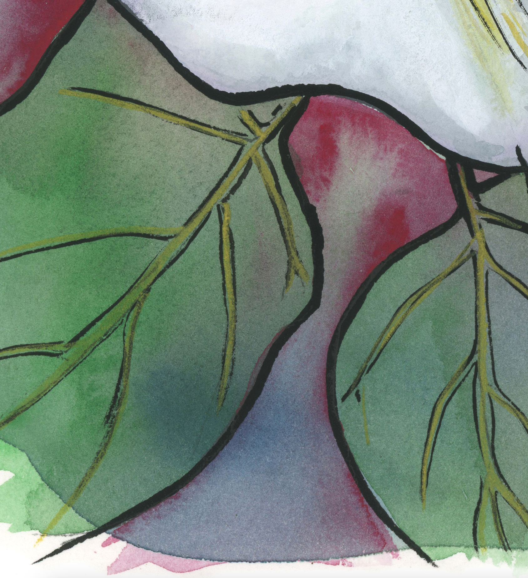 This piece centers on a single moon flower in full bloom at night—quiet, luminous, and slightly otherworldly. Painted in watercolor, gouache and ink, the soft white petals contrast with deep green leaves. Surrounding the flower is a halo of red, layered intentionally as a symbolic warning—referencing the moon flower’s reality as an extremely poisonous plant. The red introduces tension, underscoring the contrast between beauty and danger. The moon flower blooms at night and fades by morning, heightening its sense of mystery and impermanence.
